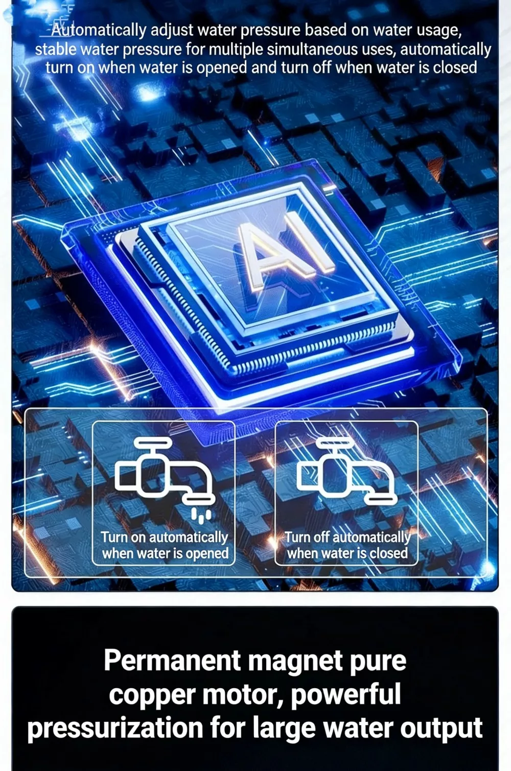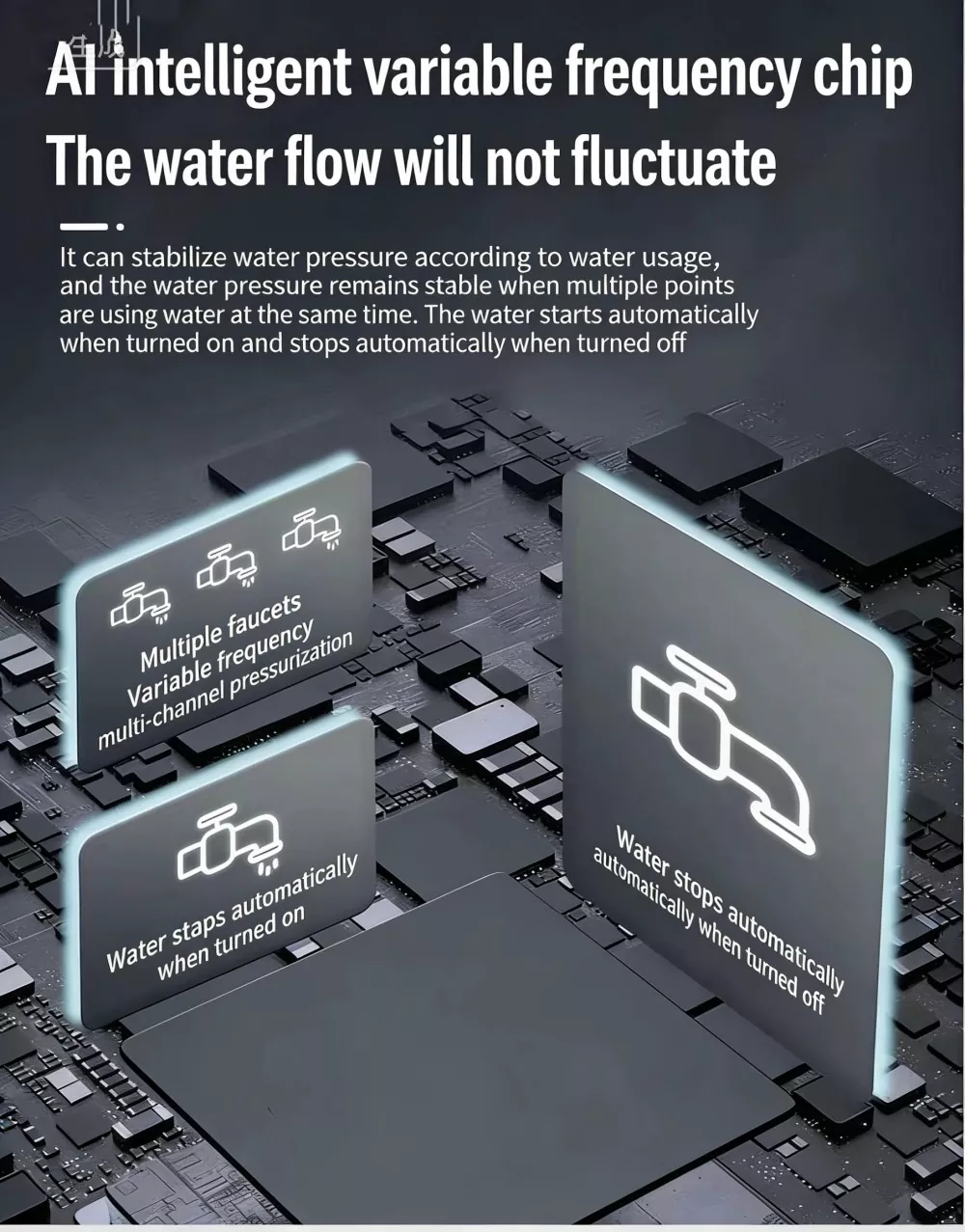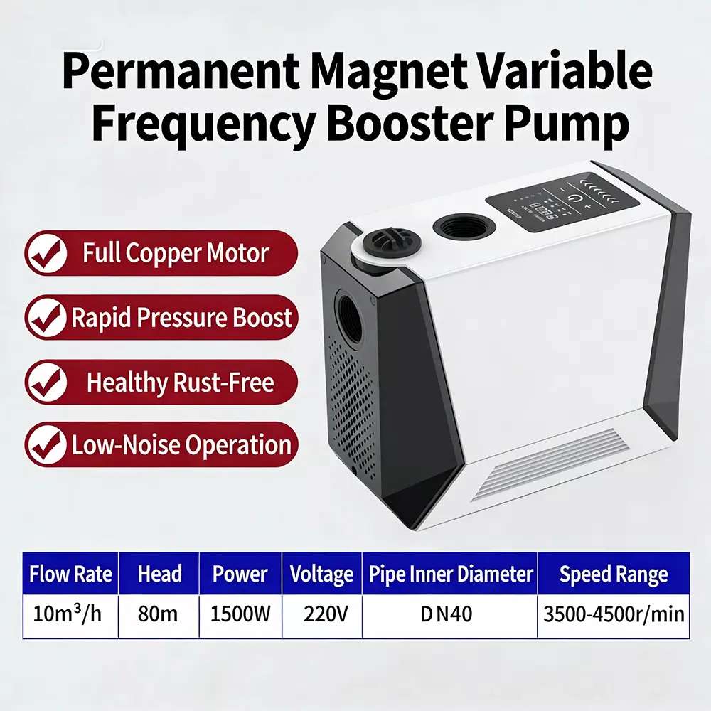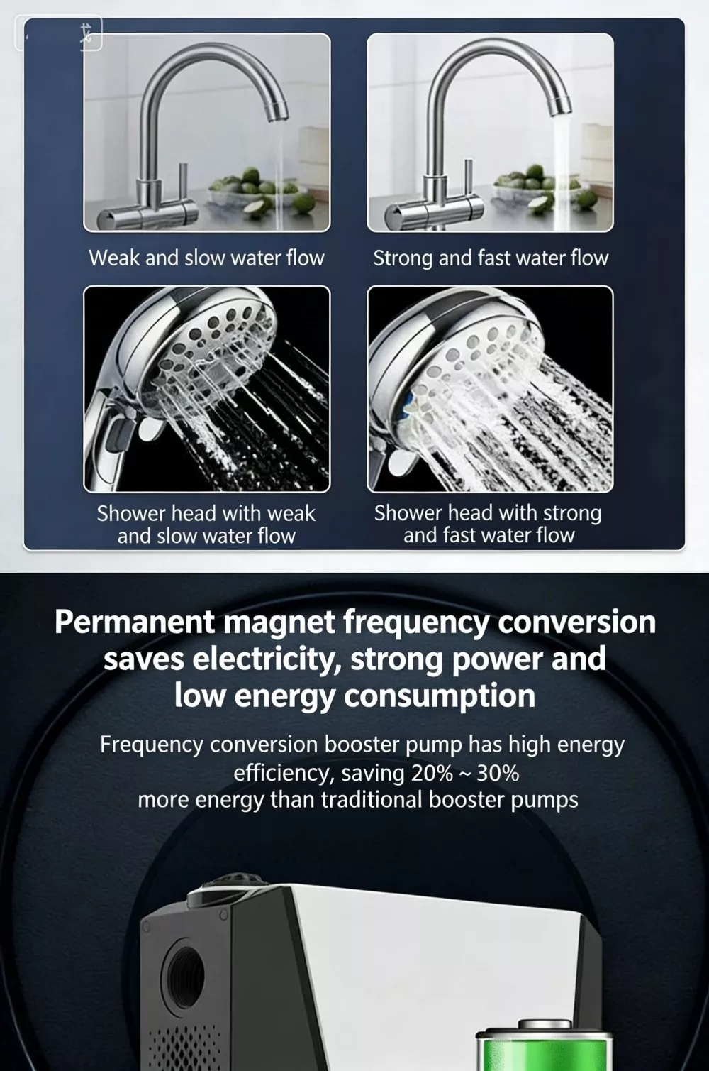 대형 아파트 및 빌라를 위해 특별히 설계된 이 대형 지능형 부스터 펌프는 지능형 가변 주파수 제어 시스템과 결합된 고급 브러시리스 영구 자석 순수 구리 모터 기술을 채택합니다. 자동 시작-정지 및 다중 기어 무단 속도 부스트 기능을 실현합니다. 디지털 제어 디스플레이 화면을 갖추고 있으며 세련된 외관, 작은 설치 공간 및 쉬운 설치가 특징입니다. 대형 지능형 부스터 펌프는 부족한 가정용 수압 문제를 완벽하게 해결하여 안정적이고 효율적이며 매우 조용한 물 공급 경험을 제공합니다.