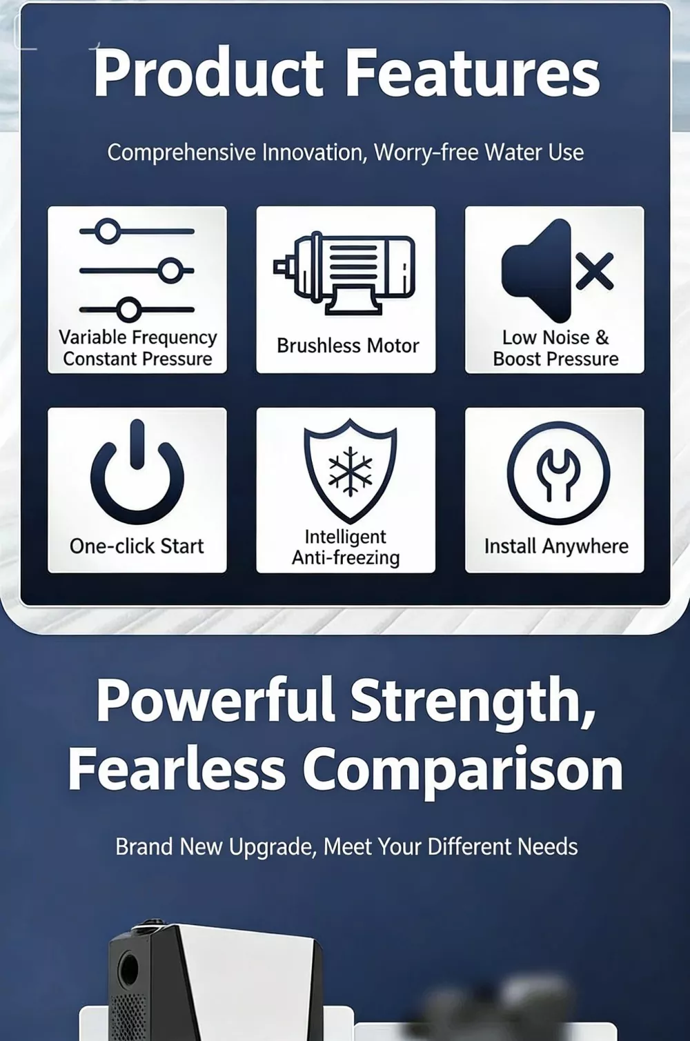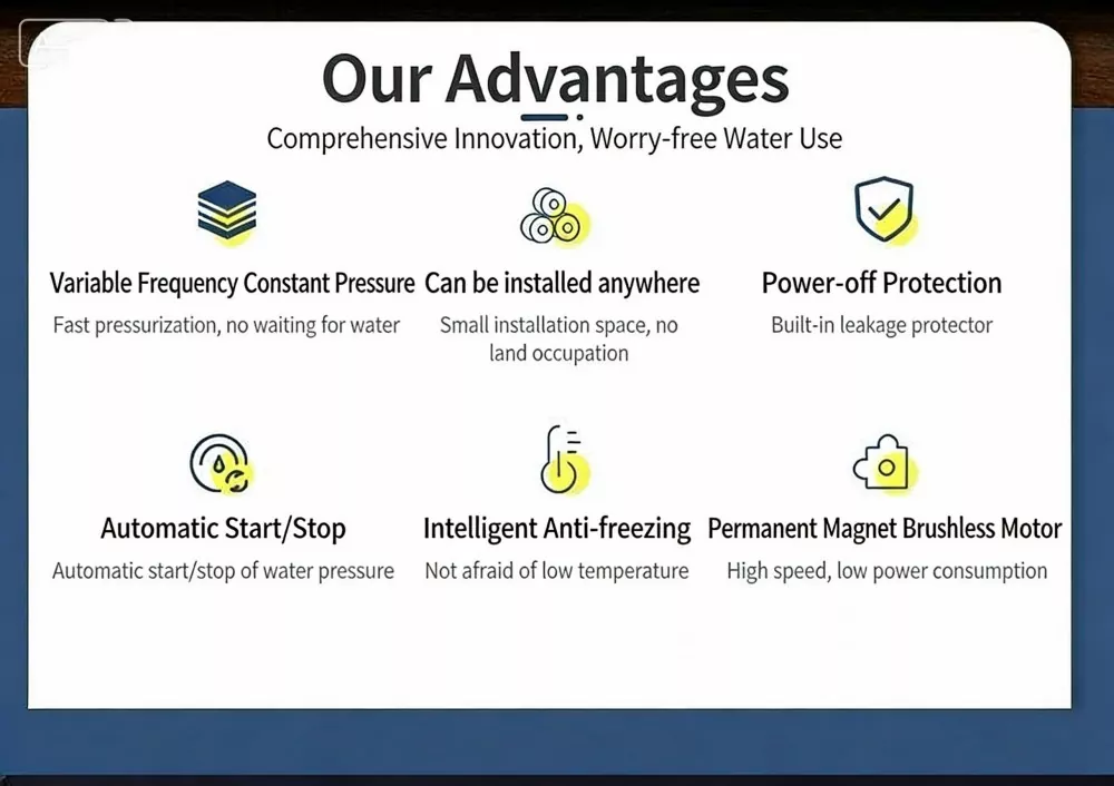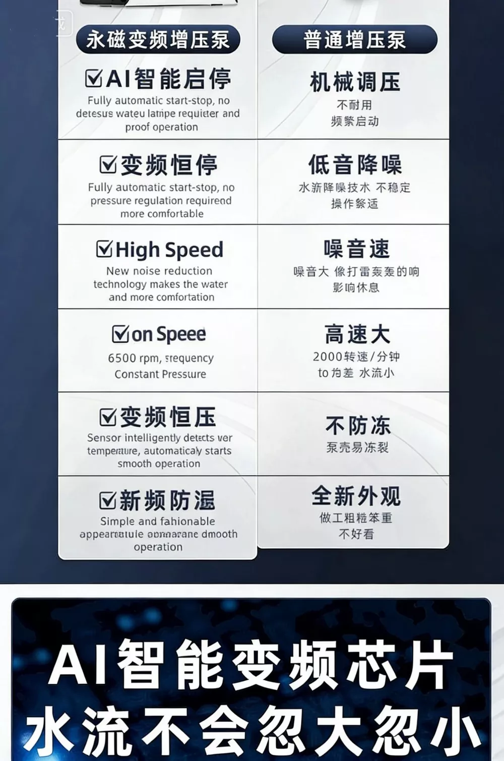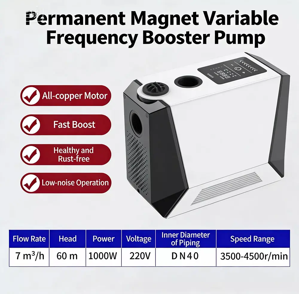 대형 아파트 및 빌라를 위해 특별히 설계된 이 대형 지능형 부스터 펌프는 지능형 가변 주파수 제어 시스템과 결합된 고급 브러시리스 영구 자석 순수 구리 모터 기술을 채택합니다. 자동 시작-정지 및 다중 기어 무단 속도 부스트 기능을 실현합니다. 디지털 제어 디스플레이 화면을 갖추고 있으며 세련된 외관, 작은 설치 공간 및 쉬운 설치가 특징입니다. 대형 지능형 부스터 펌프는 부족한 가정용 수압 문제를 완벽하게 해결하여 안정적이고 효율적이며 매우 조용한 물 공급 경험을 제공합니다.