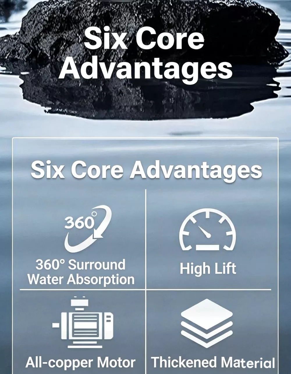 360° 바닥 흡입 설계: 사각지대 없이 물을 흡수하여 반복적인 위치 조정 없이 효율적인 배수가 가능합니다.